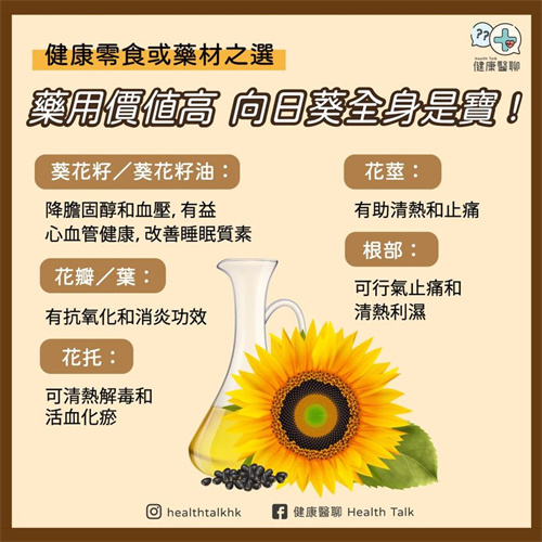 向日葵除了長得好看,原來還非常有益。除了較常見的葵花籽和葵花籽油外,其他部位都可以食用,更具有不同藥用價值。無論是作為零食或是中藥,都是健康之選。