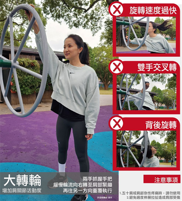 「大轉輪」可以訓練肩部、上肢並增加肩關節活動度,當五十肩或肩部急性疼痛時請勿使用,亦應避免過度伸展拉扯造成肩部受傷。
