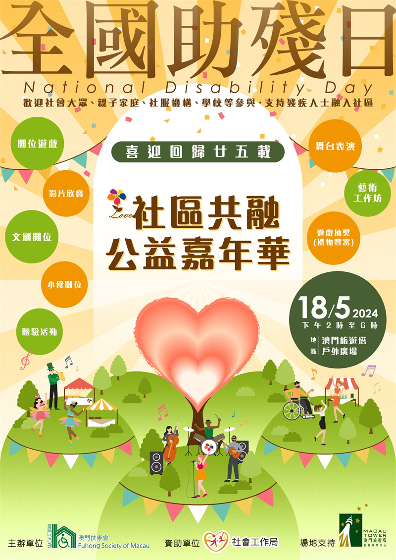 明天(5月18日)為全國助殘日,本會都受扶康會邀請參加「社區共融公益嘉年華 」,透過嘉年華展現殘疾人士的才華與能力,加深大眾對殘疾人士的了解和尊重,透過活動的交流和互動,拉近大眾與殘疾人士之間的距離。本會屬下的啟康中心、啟能中心和心明治小食店將在現埸擺設攤位,義賣學員的手工藝作品、擺設、美食等,活動時間下午2時至6時,在澳門旅遊塔戶外廣場開展,歡迎大家多多支持。