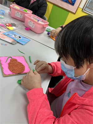 課堂上,導師先作示範,把不同顏色的輕黏土分給各服務使用者,讓他們各自嘗試及操作,搓出不同形狀的輕黏土,通過不同的手法,拼湊出不同的圖案,並利用工具增添不同的紋理,讓作品更立體地呈現出來,服務使用者一邊帶著喜悅的心情,一邊製作,最後完成漂亮的成品亦能為服務使用者帶來成就感,提高他們學習和創作的興趣。