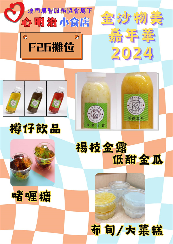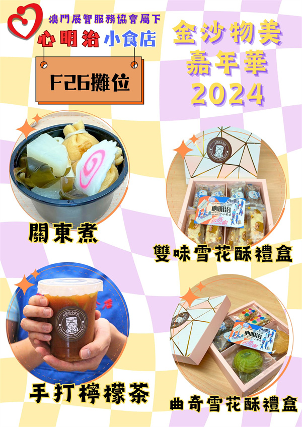 心明治小食店今年繼續受金沙中國邀請在「2024金沙物美嘉年華」設置展位,為大家提供學員參與製作的特色小食及飲品,本店專為智障人士提供工作訓練及就業支援服務,透過眞實的工作環境學習,提升他們的工作能力。是次推出多款夏日特飲、雪花酥及關東煮。本店的展位 在F26,到時請大家多多支持!