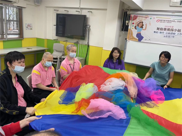 起初老師透過有趣的動作歡迎每一位參加者,以此與大家建立儀式感。其後,透過拍打身體提升身心的連繫及提高對身體部位的認知;以動作音樂提升動機去回顧快樂、悲傷、害怕和憤怒感的情感表達,並運用海綿球、沙錘、彩虹傘等作為媒體引導參加者作自我控制及情感表達。