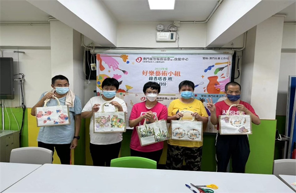 星期六興趣班是一個讓服務使用者在中心接受培訓以外又一個可以展示其自身能力的好機會。中心在本月舉辦了蝶古巴特麻布袋手工製作興趣班。在課堂中,導師讓服務使用者選擇一些自己喜歡的圖案,並把他剪出,隨後放在帆布袋上再作構圖、貼上。由於蝶古巴特這種材料較為輕薄,在撕開後再上膠水是有一定難度,但導師示範及協助下,服務使用者亦能逐一逐一地完成,創作出一個獨一無二,屬於自己的製成品,導師與他們也非常開心滿意。