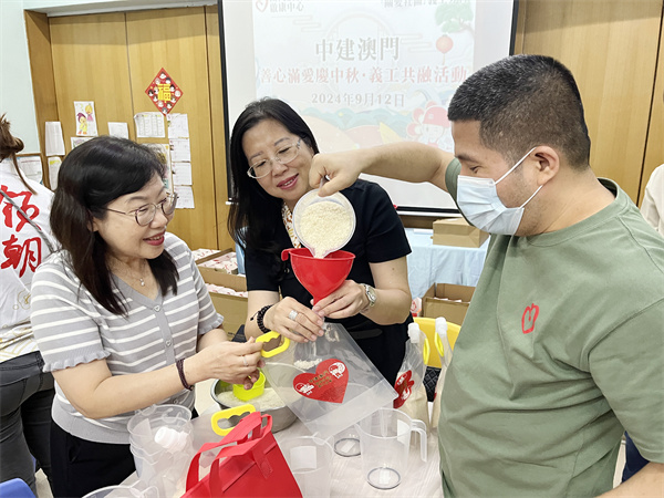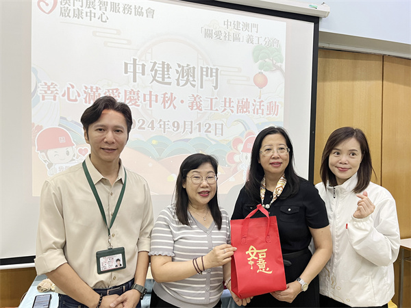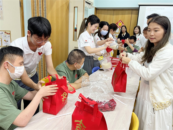 中建澳門副總經理、聯誼會會長呂育敏昨日帶領中建澳門義工隊前往澳門展智服務協會啟康中心,與中心學員共同開展慈善產品共融包裝工作。