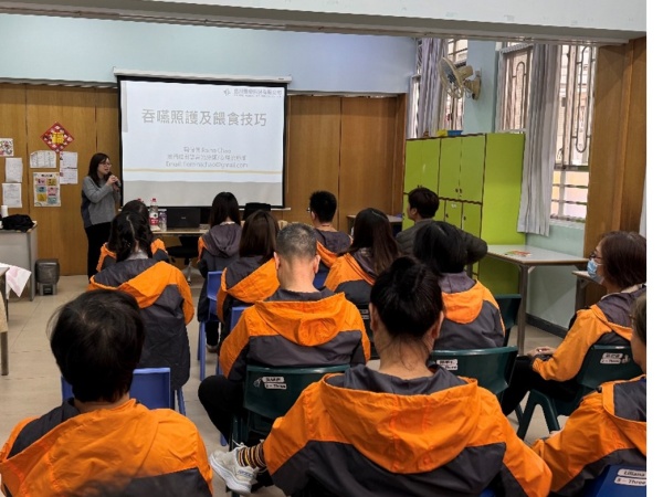 語言治療師透過工作坊講解正常咀嚼吞嚥的生理機轉、咀嚼吞嚥障礙所帶來的危害等,並為職員提供教學,學習吞嚥障礙喂食及擺位的技巧,正確的喂食可預防吸入性肺炎及其合併症,此工作坊為職員提供一個持續優化自我與學習的機會,透過此講座可提升中心職員的照護技巧。
