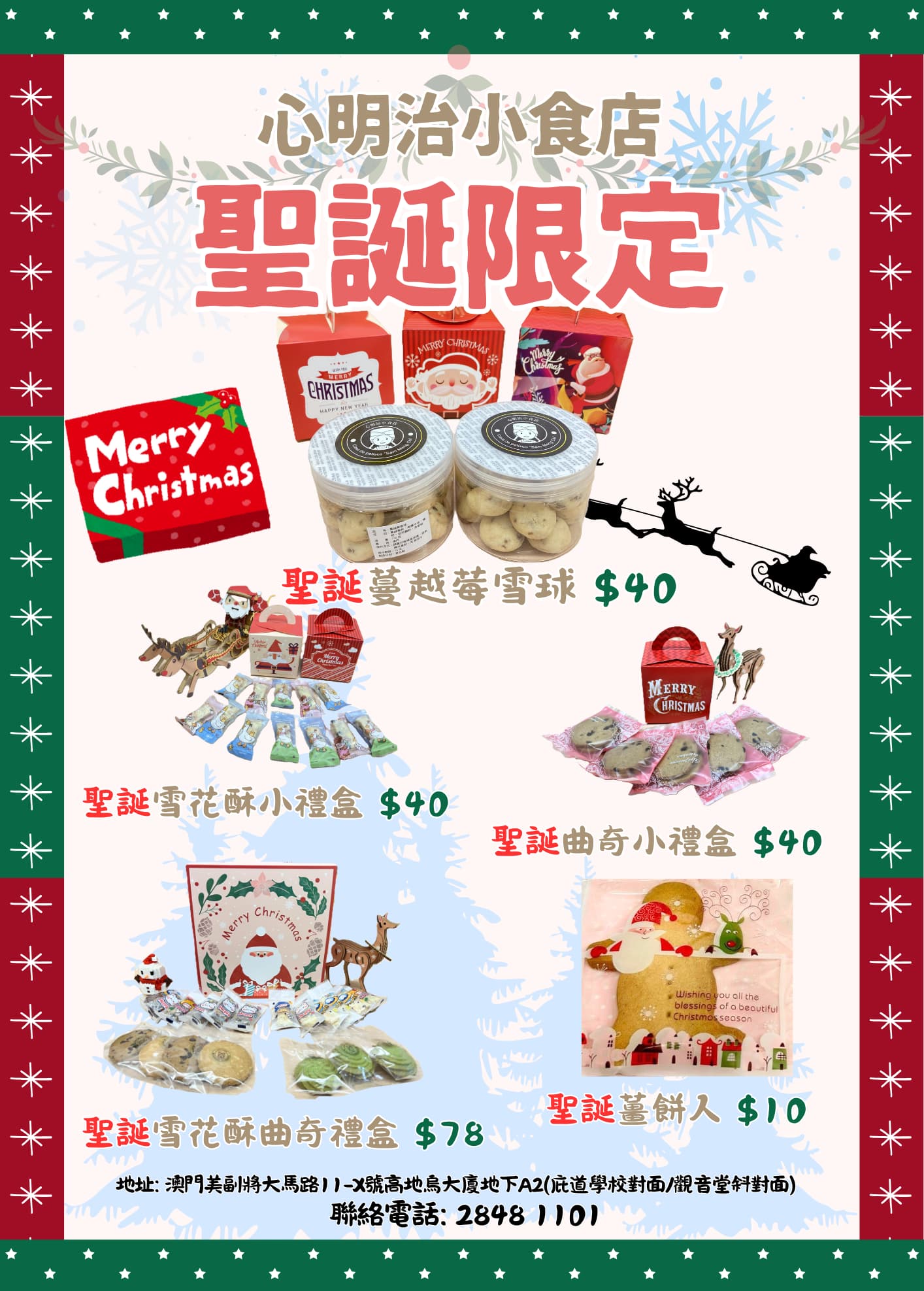 都有各款優惠和小食可以訂購,有充滿聖誕氣息的蔓越莓雪球、雪花酥、曲奇餅及薑餅人,和聚會必備小食、套餐和餐盒,歡迎大家提早預訂,聯絡請致電