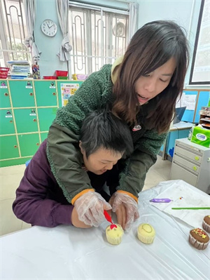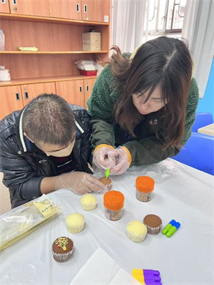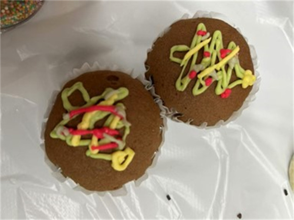 因聖誕節準備來臨,啟康中心與學員一起自制聖誕杯紙蛋糕,老師協助學員繪製簡單的聖誕樹圖案。使用不同顏色的食用朱古力,亦可以順便讓學員鍛鍊手指精細的動作。透過製作杯子蛋糕,讓學員加深認識聖誕節及節慶會出現的食物。
