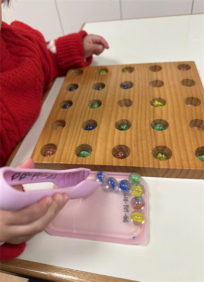 夾夾樂: 使用筷子將豆子、棉花糖等小物品夾到不同的容器中,如洞洞板,食飯碗等。