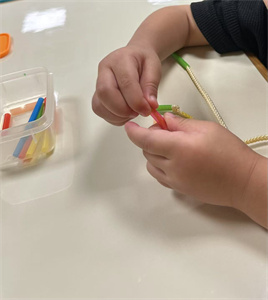 選擇不同大小、形狀的珠珠、積木、吸管或鈕扣,讓孩子練習穿線,可以提升前三指的協調和專注力。