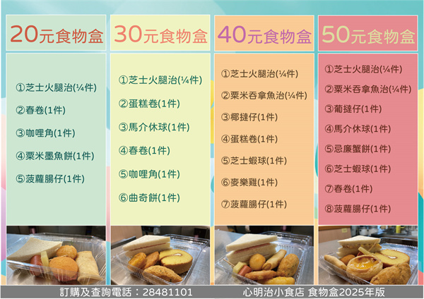 心明治2025年食物盒優惠,有多種款式供大家選擇,一人一盒更衛生,也更經濟實惠,學員能夠掌握食物包裝技巧,各人負責不同部分,組成流水線,體現團隊合作精神。如有查詢及訂購,歡迎致電28481101或掃描本店微信號。
