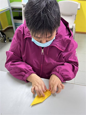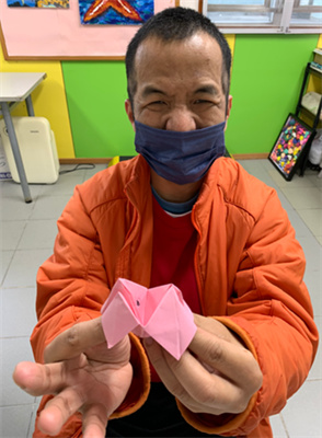 導師先播放示範影片,讓服務使用者們有基本認知。隨後,導師分解步驟,服務使用者一步一步跟著導師的指示,透過自己的小手指將紙張對齊、摺壓,,摺出不同的精美摺紙作品。在過程中,訓練服務使用者小手肌的靈活運用,服務使用者更一起玩上經典小遊戲「東西南北」,增進服務使用者們彼此的交流,為摺紙增添樂趣。
