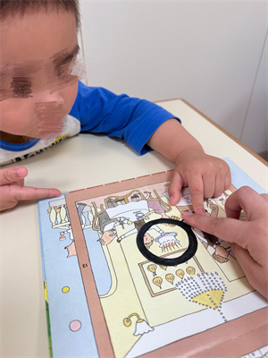 另外也可以使用一張A4紙,在中間畫一個放大鏡,但不剪下來喔~只剪走放大鏡的鏡面部分,大範圍的遮蓋,能使專注力相對較弱的孩子更加專注在一個位置~不被書中的其他部分所吸引,專注力更加高!當然在閱讀的過程中,需要加上家長不同聲音的演繹,越誇張越能吸引孩子喔~例如:「嘩!睇下係咩黎嘅?係小貓呀!」又或者「嗯?小貓去左邊到呀?我地一齊搵下啦!嘩!搵到啦你好叻呀~」