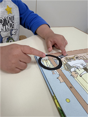 家長可以邀請孩子一同製作及裝飾,放大鏡中間的鏡面部分可以吸引孩子去觀察,使用放大鏡一同探索書本的內容,大的放大鏡可以觀察整體人物行為,而小的放大鏡可以協助孩子觀察細小的事物。使用放大鏡用尋寶的形式在書中移動,能使孩子更加專注~