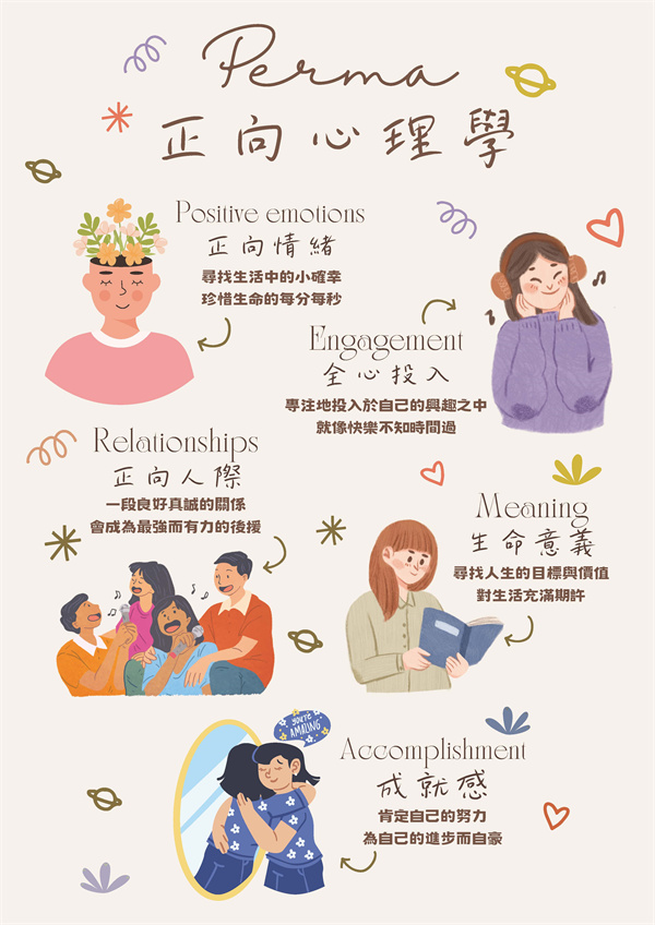 正向心理學的主題是「幸福」,它是一個貌似簡單但又極其複雜的概念,也是人類從古至今就不斷努力地擁有和追求的目標。幸福有五個可以測量的元素(PERMA),當中包括 正向情緒、全情投入、人際關係、意義和成就感。不過,這些元素沒有哪一個可以單獨界定幸福,但是它們都對建立幸福有莫大的貢獻。