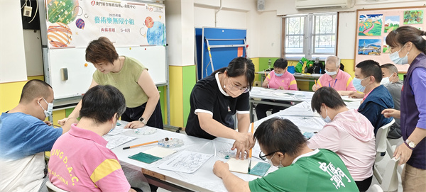 課堂中,導師每節都會圍繞不同主題創作示範作品,從嬌艷花卉到靈秀山水,從絢麗夕陽到生活場景,題材豐富多樣。在導師耐心清晰的步驟指導下,服務使用者們一筆一劃勾勒線條,隨著筆觸累積,生動的圖案逐漸在畫布上顯現。