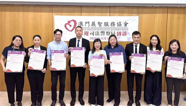 澳門展智服務協會常務副會長馬騰日前帶領各服務單位代表,於啟康中心接待司法警察局社區警務組職務主管胡嘉健一行到訪,雙方就現時社區新型詐騙手法及誘騙犯罪等個案交流,提高協會工作團隊的防罪意識。