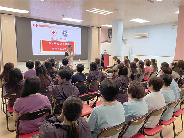 啟智學校於日前特邀澳門紅十字會到校為員工舉行了三小時的急救培訓講座,講座由紅十字會急救導師王家強先生負責講解,主要目的是讓員工瞭解急救的意義及掌握基本的急救知識,講座的內容含涵蓋了多個方面,包括急救原則、哽塞、休克、出血、創傷與傷口、燒傷與燙傷、癲癇等各症狀、措施處理及注意事項,於講座上,導師亦向同事們展示了正確的急救示範。