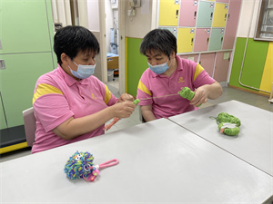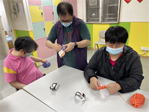 課堂上,導師先示範製作步驟,再做指導。服務使用者專注操作,已完成的服務使用者更主動幫助他人。