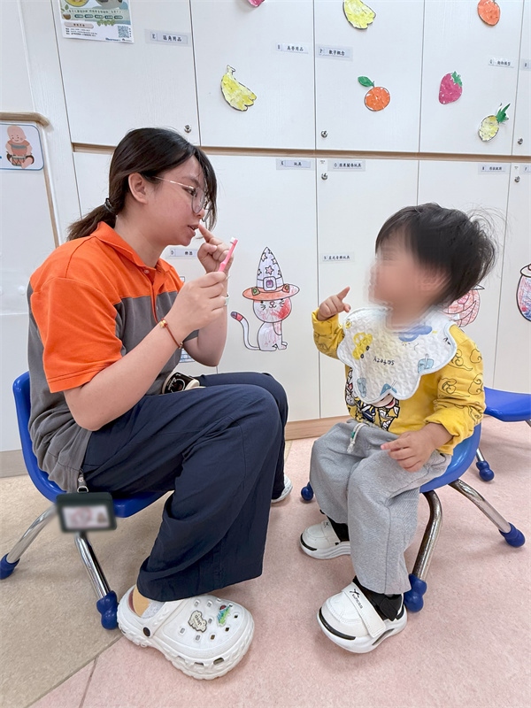 以課堂作例子,在學習不同日常用品時,治療師在說出物品名稱的同時加上代表性(representational)。手勢如「牙刷」會做出刷牙的動作,「杯子」會做出喝水的動作等,同時或會再加上口語刷牙牙,飲水水等句子,讓孩子理解能以手勢表達自己的需求、表達不同的物件或與物件相關的功能,並與口語作連結。在日常生活中也可將不同物品加上相對應的動作(如:腳仔踢一下代表要踢波,切手勢代表要用刀將物品切開,指一指耳仔代表需要聽歌等),當孩子有需求又未能使用口語表達時,能運用身體及手勢動作表達需求,情緒及分享資訊,當孩子做出手勢時,父母可以很開心地給予回應,促使孩子更願意表達,並在此過程中反覆連結語音、手勢及物體。例如孩子比出飲,父母立即回饋「喔~你肚餓了,想飲奶奶喔」讓孩子聽到這個詞彙的口語及運用方式。