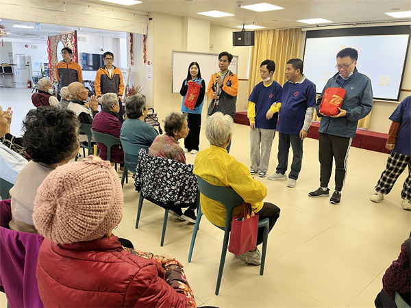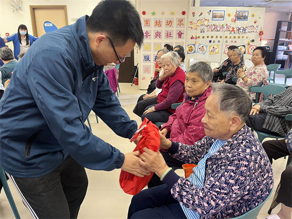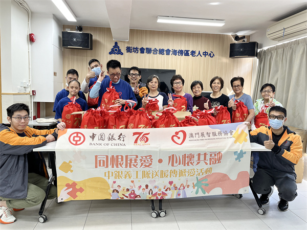 這個秋日澳門中銀支持下,熱心的澳門中銀義工隊一眾朋友與澳門展智服務協會的學員開展了「同根展愛•心懷共融」社區傳愛活動,大家親手將一份份福米和物資包裝成充滿溫度的愛心福袋,而這些承載著關懷和愛的福袋,由啟康中心社區組帶領一眾學員代表澳門中銀和本會,親自送往本澳兩間長者中心,送給每一位受人尊敬的長輩們手中。