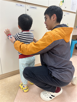 雙手按在桌子或床上站立,如站穩可以嘗試只用單手按在桌子或床上,再給予玩具把玩。