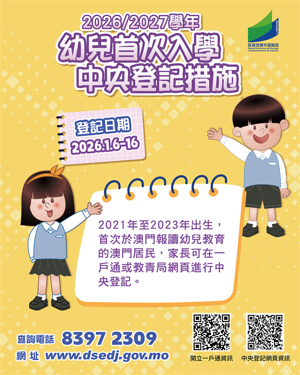 2026年1月6日上午10時至1月16日23時59分為“幼兒首次入學中央登記期”,登記的對象為2021年至2023年出生且首次報讀幼兒教育的幼兒。
