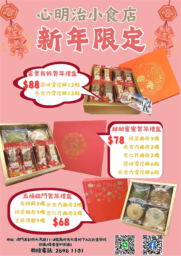 農曆新年快到啦!今年心明治繼續推出多款精美禮盒, 內含各種曲奇及雪花酥!送禮自用兩相宜!歡迎致電28481101、微信或親臨澳門美副將大馬路11-X號高地烏大廈地下A2到本店訂購。
