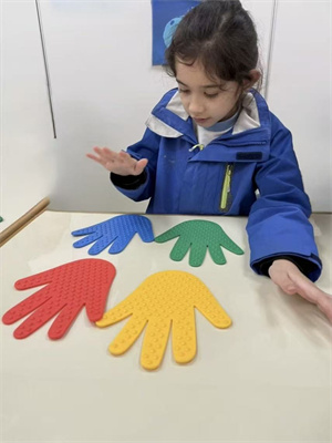 最後,學童來挑戰顏色歌。學童需要根據聽到的顏色拍到相應位置,過程中學童感到十分新奇有趣,完成時紛紛咧嘴大笑,充滿成就感,整個課堂都充滿著歡樂氛圍。