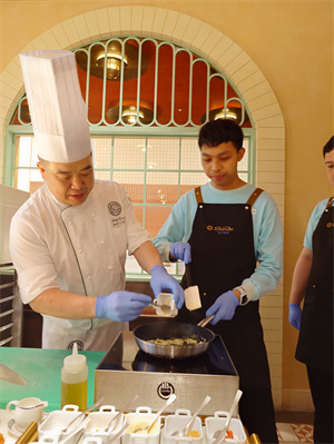 隨後,兩位本澳行政大廚示範經典澳葡名菜「非洲雞」。從醃製雞腿、調配香濃醬汁,到煎香焗烤,每一步都細心講解,並再次邀請學員參與攪拌醬汁與刷醬過程,讓大家親身感受澳門獨有的辣中帶甜、椰香濃郁的風味菜餚。