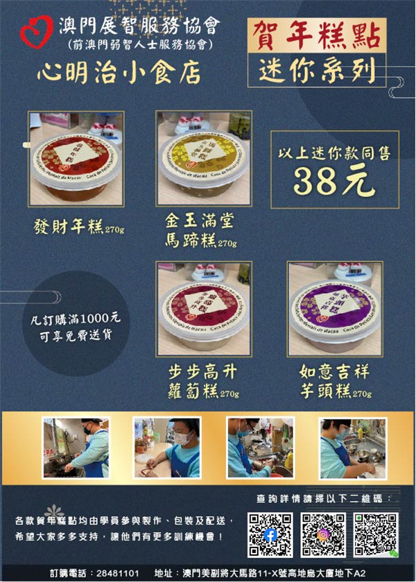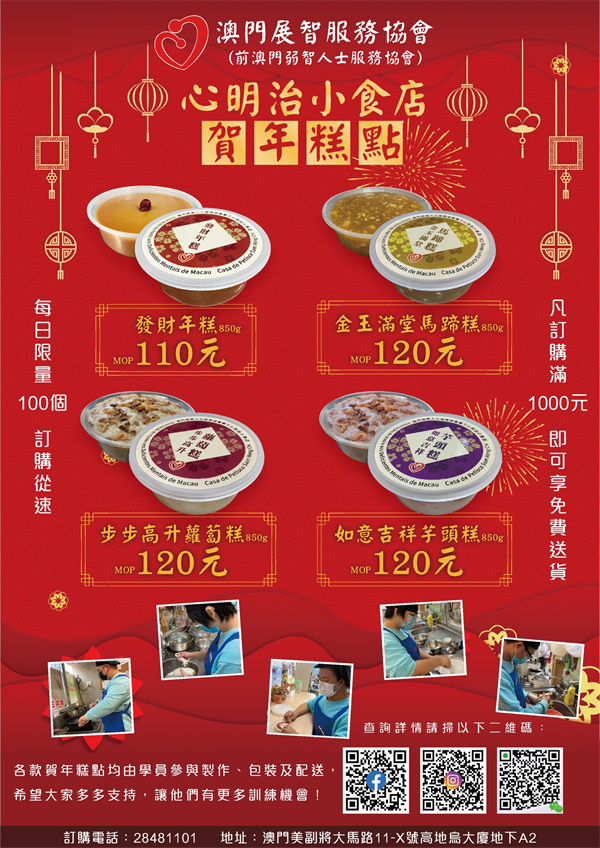 新年將至,心明治推出一系列賀年糕點,讓學員參與製作、包裝及配送,提供更多的訓練機會予學員,希望大家多多支持!共四款賀年糕點,包括「發財年糕」、「步步高升蘿蔔糕」、「如意吉祥芋頭糕」和「金玉滿堂馬蹄糕」!