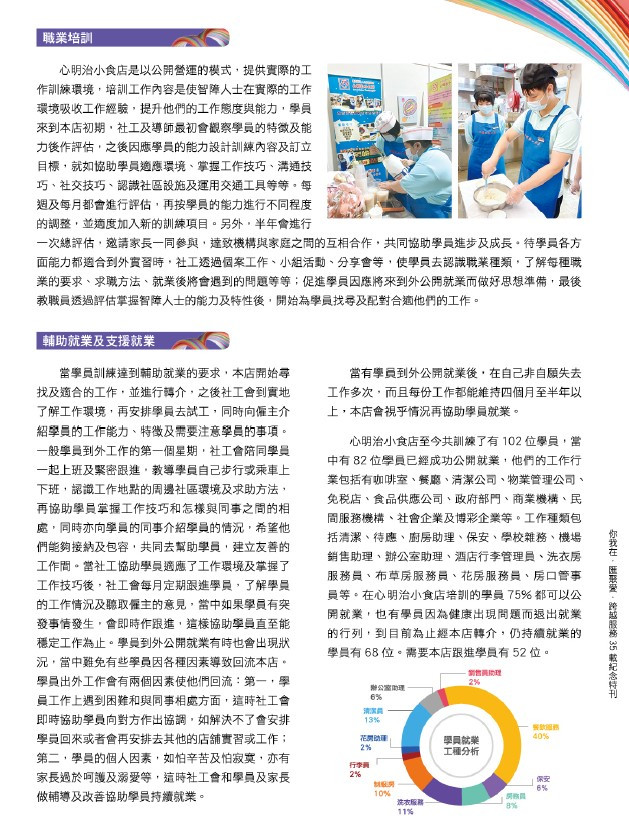 心明治小食店隸屬於 澳門展智服務協會(前澳門弱智人士服務協會),由社會工作局資助,於二零零二年十二 月十九日正式開業,專為十六至四十五歲智障人士提供輔助就業訓練,透過實際工作使其發揮潛能,融入社會。