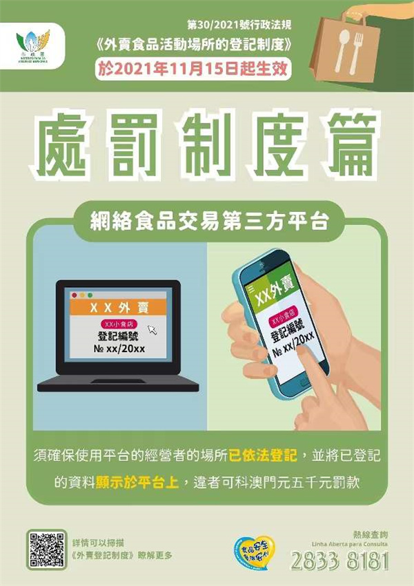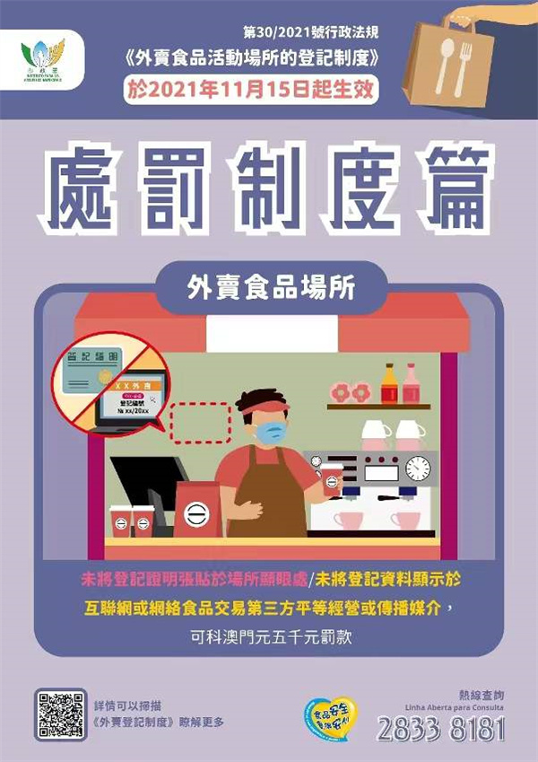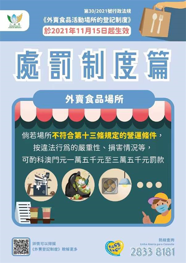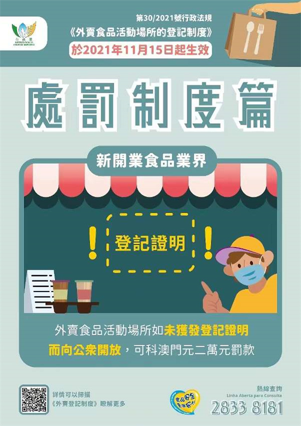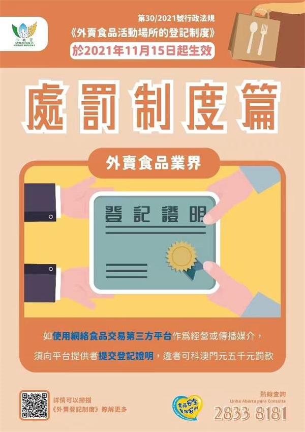 如對外賣登記制度有任何疑問,可登入市政署食安資訊網www.foodsafety.gov.mo或手機應用程式內的“外賣食品活動場所的登記制度”專頁瞭解詳情,或可致電食安專線2833 8181查詢。