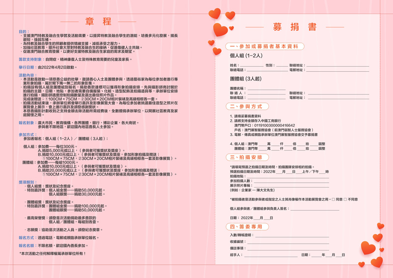 · 本活動是啟動一項慈善公益的壯舉,邀請善心人士及團體參與,透過藝術家為每位參加者進行專業形象拍攝,屬於閣下獨一無二的形象影集。