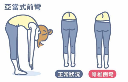 另一種診斷方法是「亞當式前彎」。患者站直雙腳,身體向前方彎曲大約45至90度,雙手向下方放鬆伸直,醫生將從旁觀察肩膊、肩胛骨、腰部是否對稱。如果背部出現明顯歪斜、其中一邊的肩胛骨明顯突出或凹陷,便有可能患上脊柱側彎。家長在帶子女進行專業診斷前,也可先在家以這個方法進行簡單判斷。