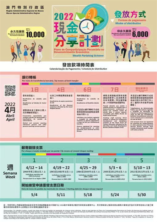 行政會發言人張永春表示,基於新型冠狀病毒肺炎疫情反覆,對本澳經濟復蘇帶來不確定性,為紓解民困,在《2022財政年度施政報告》中,特區政府堅持民生福利開支不減少,繼續實施上一年度的稅務優惠措施,並延續教育、醫療、社會保障及現金分享計劃等多項惠民措施。在本年度現金分享款項發放安排方面,特區政府決定按以往兩年提前發放的做法,於下(4)月起依次發放。