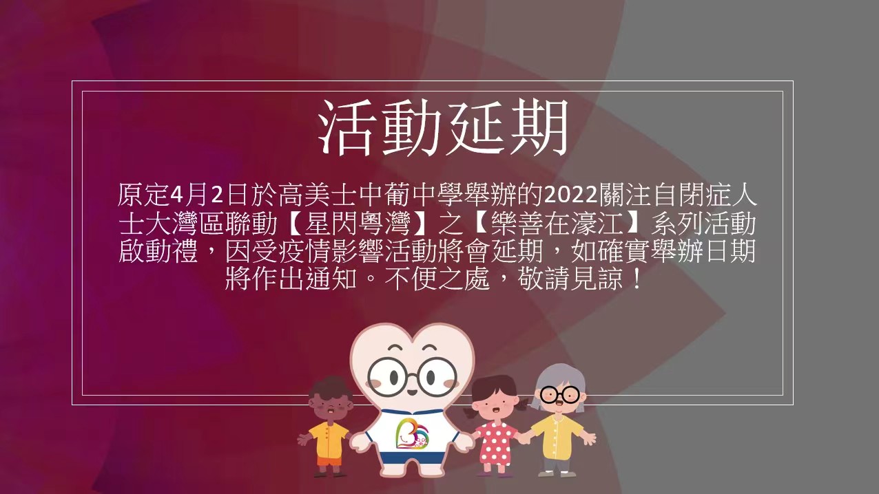 原定4月2日於高美士中葡中學舉辦的2022關注自閉症人士大灣區聯動【星閃粵灣】之【樂善在濠江】系列活動啟動禮,因受疫情影響活動將會延期,如確實舉辦日期將作出通知。不便之處 敬請見諒!