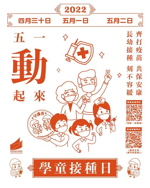 為讓家長可利用周末時間儘快為年滿3歲的子女接種新冠疫苗,教育及青年發展局與衛生局繼續於明天至下星期一(共3天)進行“學童接種日”,歡迎家長掃瞄二維碼進行預約,填妥資料包括《接種新型冠狀病毒疫苗知情同意書》後,選擇群組“學童接種日”進行預約;屆時請陪同家長/法定監護人帶備其及學童的身份證明文件。