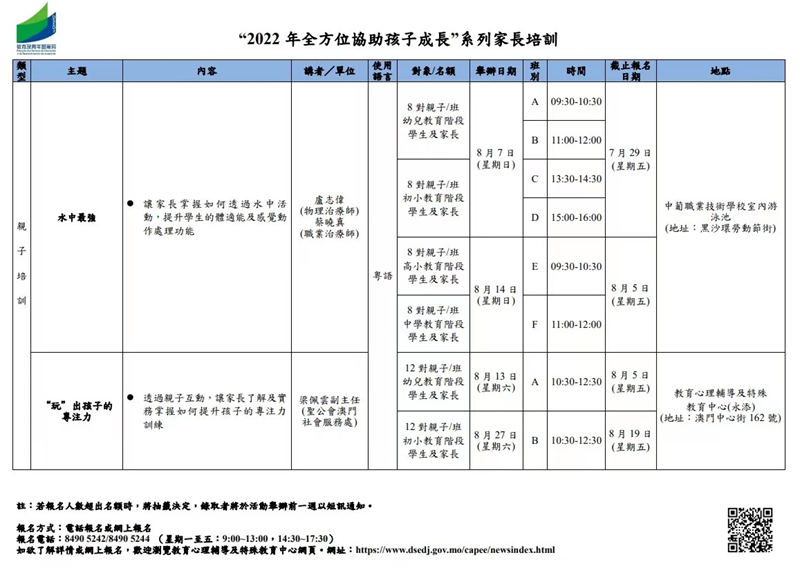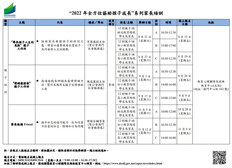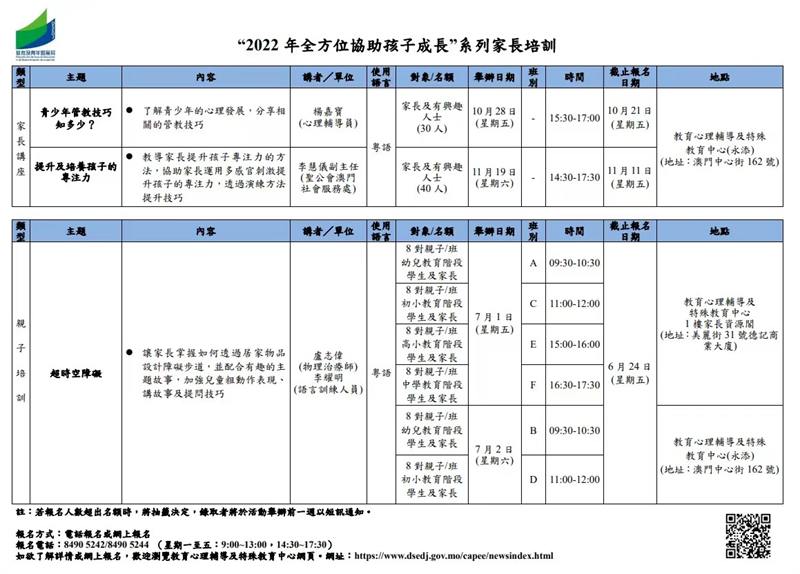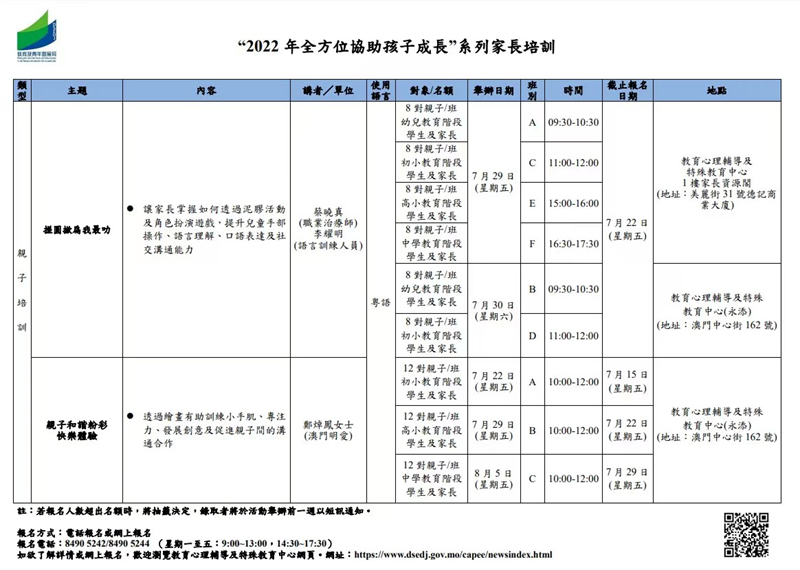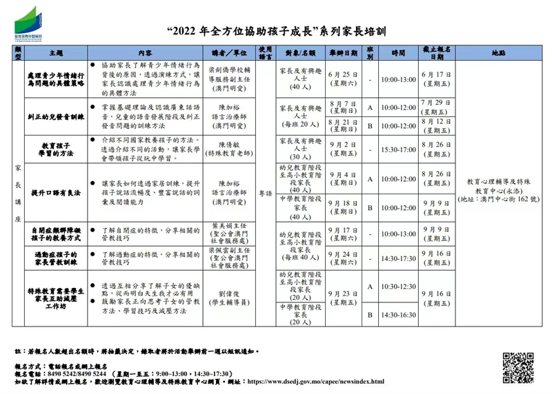 如欲了解詳情或網上報名,歡迎瀏覽教育心理輔導及特殊教育中心網頁。網址:https://www.dsedj.gov.mo/capee/newsindex.html