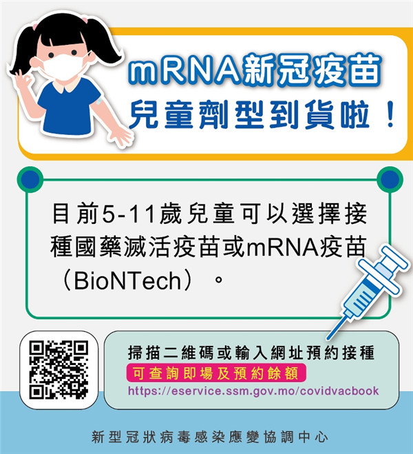 mRNA新冠疫苗兒童劑型合共九千六百劑,目前已抵達澳門。合資格的五至十一歲兒童可於網上預約。衛生局今起開始提供接種服務。接種地點包括:仁伯爵綜合醫院血液樣本收集室、綜藝館社區疫苗接種站、青洲衛生中心、氹仔海洋衛生中心。