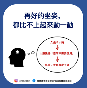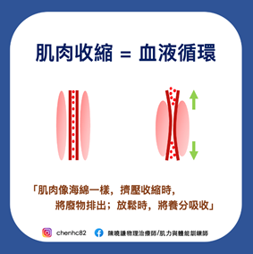 身體的血液循環,除了心臟的跳動,就是倚賴「肌肉的收縮」,常常會肩緊痠痛的原因不是你的桌椅不好,是「你沒有在動」,沒有肌肉收縮,會導致許多部位缺乏血液循環並造成缺氧,最終產生疼痛、不適等。