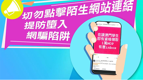 近日,有市民向司法警察局反映,稱有人於網絡社交平台一招聘群組內發佈附有網站連結的帖文,懷疑是網絡詐騙陷阱。發文者聲稱在讀澳門學生有資格領取巨額獎金,而帖文所載網站則是一頁活動報名表格,要求參加者填寫個人資料,惟沒有任何關於舉辦該項活動機構的資料。經司警局調查,證實上述活動為子虛烏有,極有可能是不法份子假借舉辧活動之名,藉此套取個人資料。