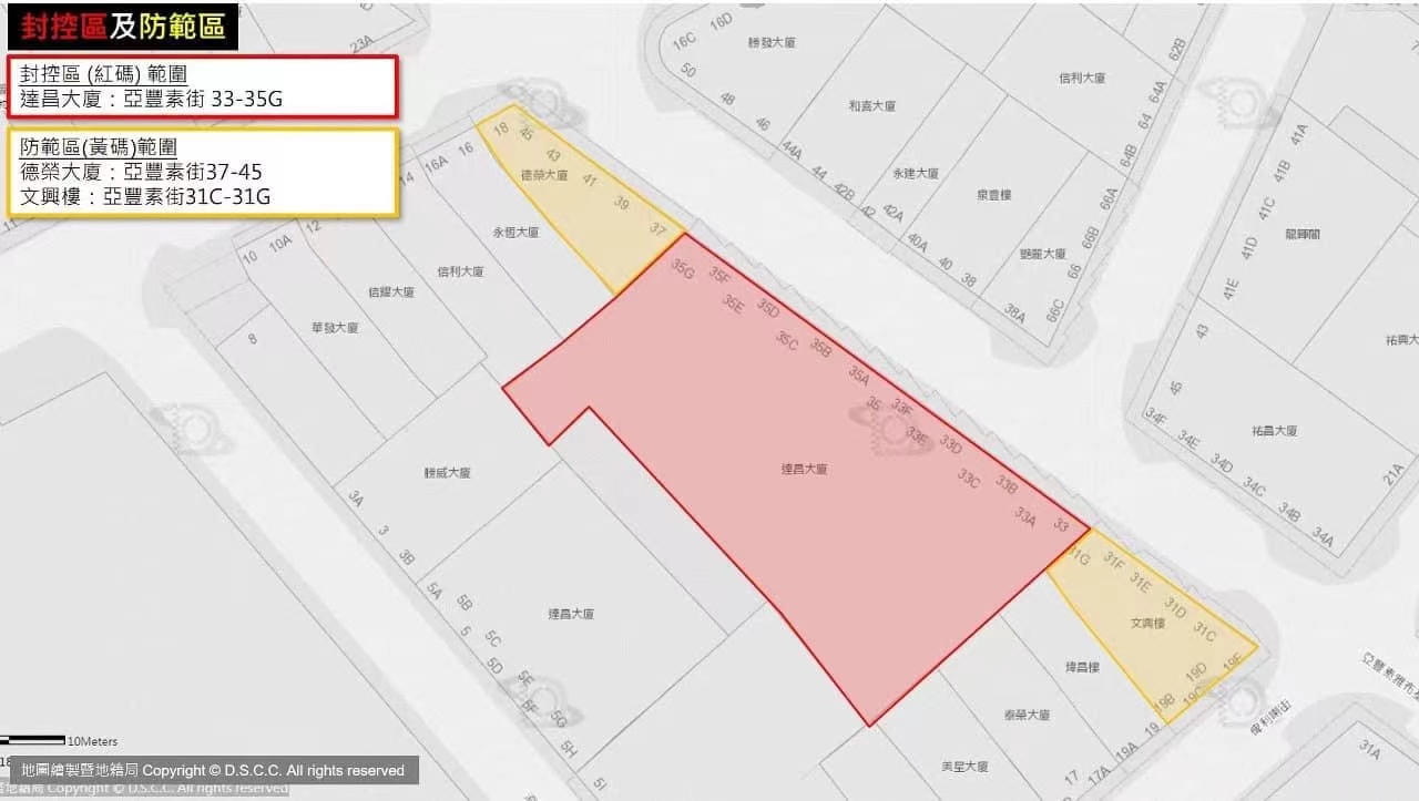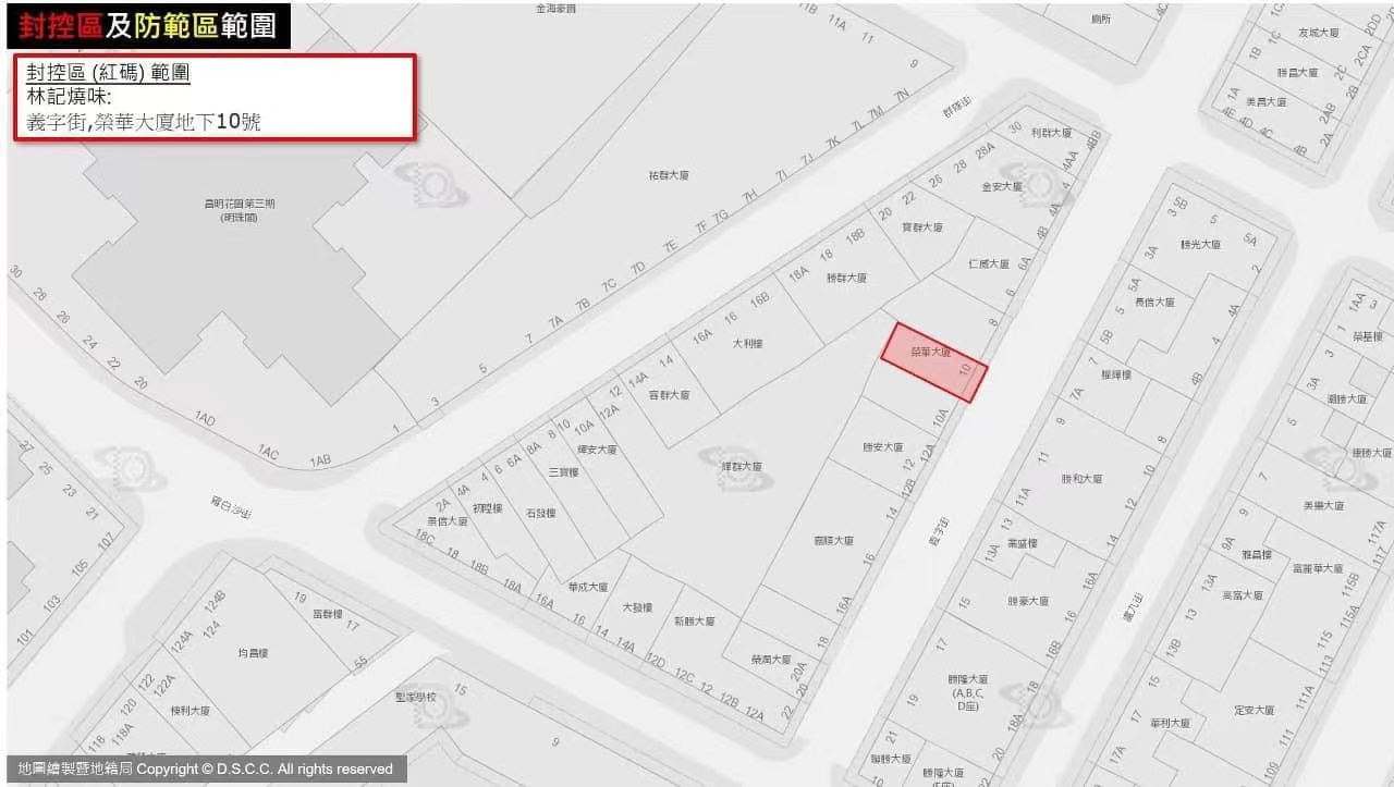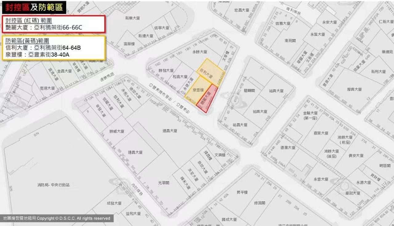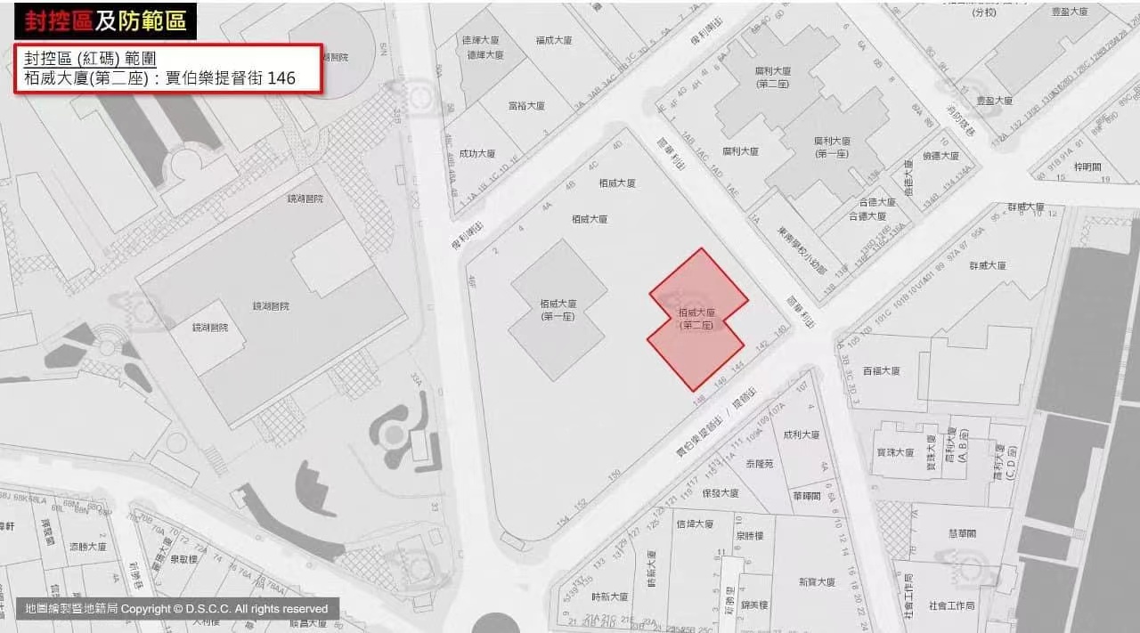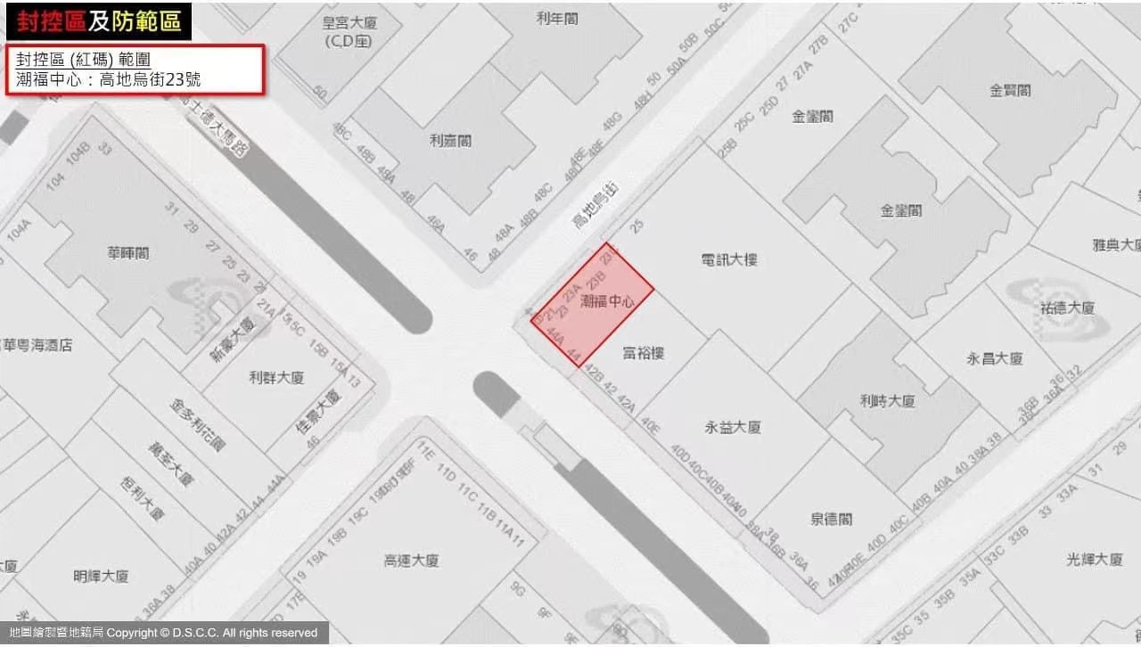 警察總局今晨消息:直至今日凌晨,共6大廈地舖列為紅碼封控區,5大廈列黃碼防範區,具體如下: