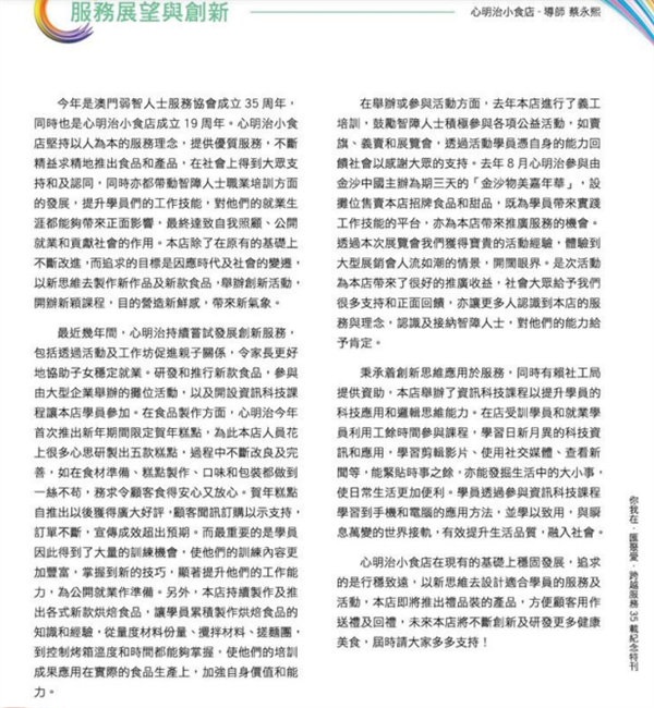 心明治小食店隸屬於 澳門展智服務協會(前澳門弱智人士服務協會),由社會工作局資助,於二零零二年十二 月十九日正式開業,專為十六至四十五歲智障人士提供輔助就業訓練,透過實際工作使其發揮潛能,融入社會。