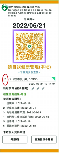 衛生局已將部分新冠病毒檢測陽性個案的風險行程添加在系統中,居民可以透過澳門健康碼應用程式進行自動或手動操作風險檢查,如具有風險行程重疊的情況,便會收到由衛生局發出的檢疫短訊通知,其澳門健康碼將自動設為黃碼 (代號2),為期四天,被設為黃碼的當天起,至之後的三天內需要進行兩次新冠病毒核酸檢測,而兩次檢測需於不同日期進行。相關人士須自行預約本澳的免費核酸排查服務,預約連結為:https://app.ssm.gov.mo/mandatoryrnatestbook,或其他常規核酸站進行自費檢測,預約連結為:https://eservice.ssm.gov.mo/rnatestbook/V21/。