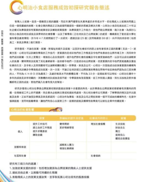 心明治小食店隸屬於 澳門展智服務協會(前澳門弱智人士服務協會),由社會工作局資助,於二零零二年十二 月十九日正式開業,專為十六至四十五歲智障人士提供輔助就業訓練,透過實際工作使其發揮潛能,融入社會。