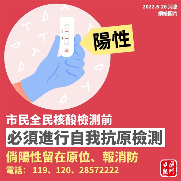民防行動中心表示,所有在澳人士必須於今日早上9時至明日傍晚6時內進行全民核酸檢測,一般站嚴格實施預約制,有特殊需要人士可採用無須預約的關愛站。市民出門前必須進行自我快速抗原測試,倘呈陽性,請通知消防(電話:119、120或28572222),本人和同住人必須留在原位,切勿出門,耐心等候檢疫和核酸檢測安排。