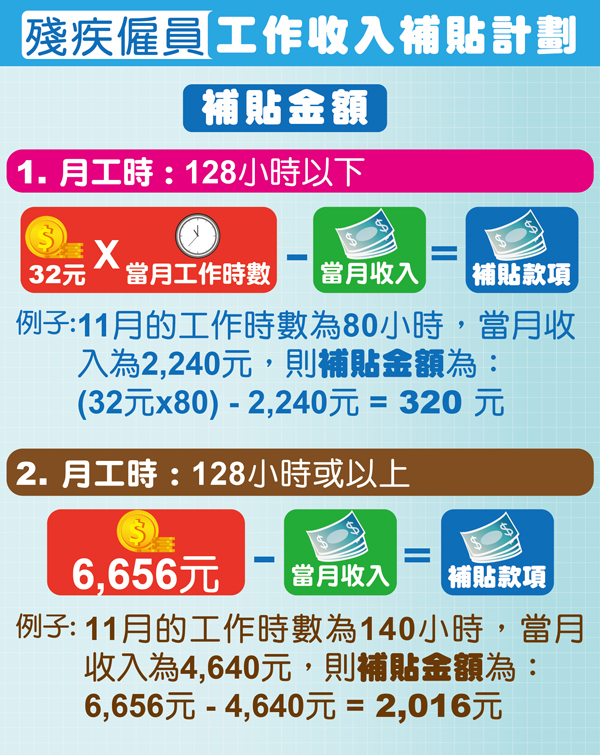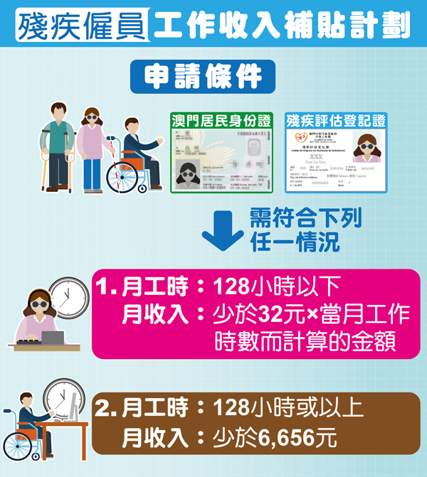 凡持有由社會工作局發出有效的殘疾評估登記證的澳門居民,並符合按月累計工作總時數少於128小時,且當月工作收入少於《僱員的最低工資》規定的每小時最低工資金額32澳門元乘以當月實際提供工作時數而計算的金額;又或符合按月累計工作總時數等於或多於128小時,且當月工作收入少於《僱員的最低工資》規定的每月最低工資金額6656澳門元,均可作出申請。