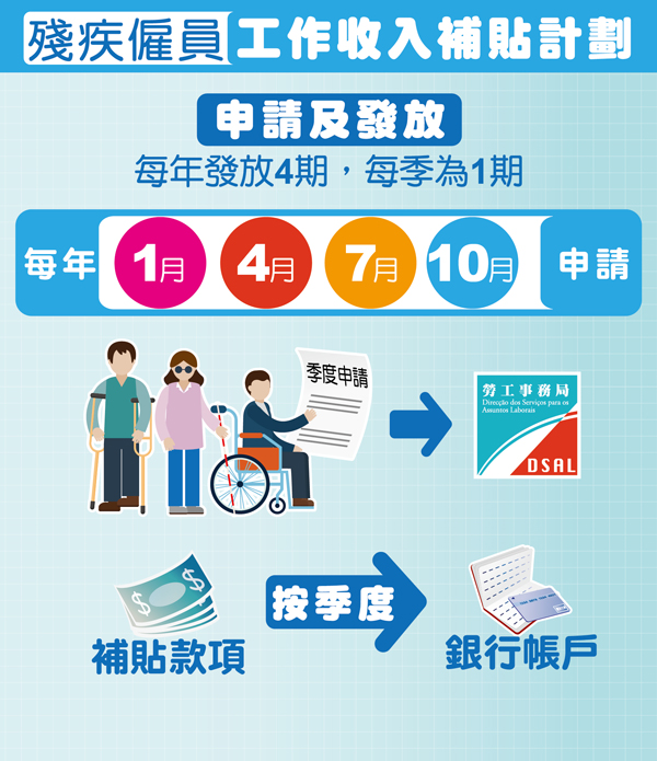 第39/2020號行政法規《殘疾僱員工作收入補貼計劃》已於去年11月1日起生效,符合資格的殘疾僱員可於2021年4月1日至30日向勞工事務局申請2021年第一季的工作收入補貼。
