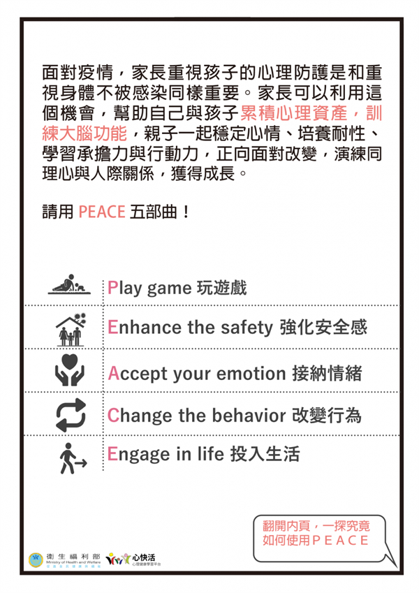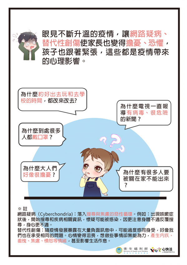 眼見不斷升溫的疫情,讓網絡疑病、替代性創傷使家長也變得擔憂、恐懼,孩子也跟著緊張,這些都是疫情帶來的心理影響。面對疫情,家長重視孩子的心理防護是和重視身體不被感染同樣重要。家長可以利用這個機會,幫助自己與孩子累積心理資產,訓練大腦功能,親子一起穩定心情、培養耐性、學習承擔力與行動力,正向面對改變,演練同理心與人際關係,獲得成長。