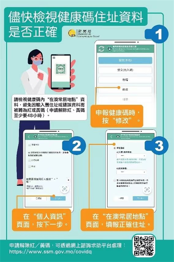 有關填報說明請參閱“盡快檢視健康碼住址資料是否正確”圖文包,連結:https://www.gcs.gov.mo/news/detail/zh-hant/N22Fc4TUhk?7